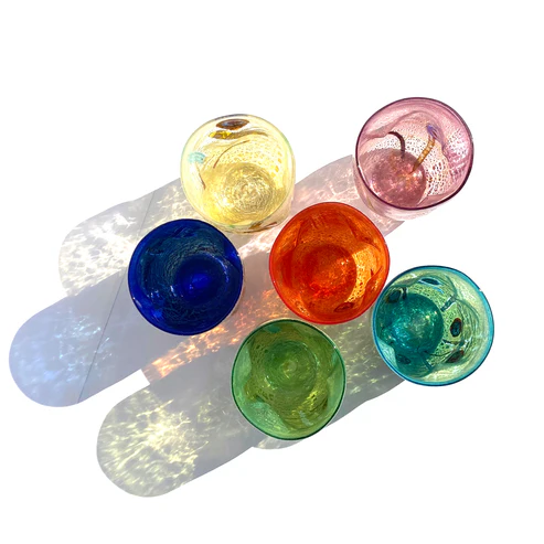 SPECIALE EDITIE “GIORGIONE”, van gekleurd glas. Deze glazen worden volledig in Italië op het eiland Murano geproduceerd volgens de eeuwenoude traditie van glasblazen, geblazen en met de hand gemaakt door meester-glasmakers. Gemaakt van kristalglas met gekleurde glaskorrels en bladzilver.