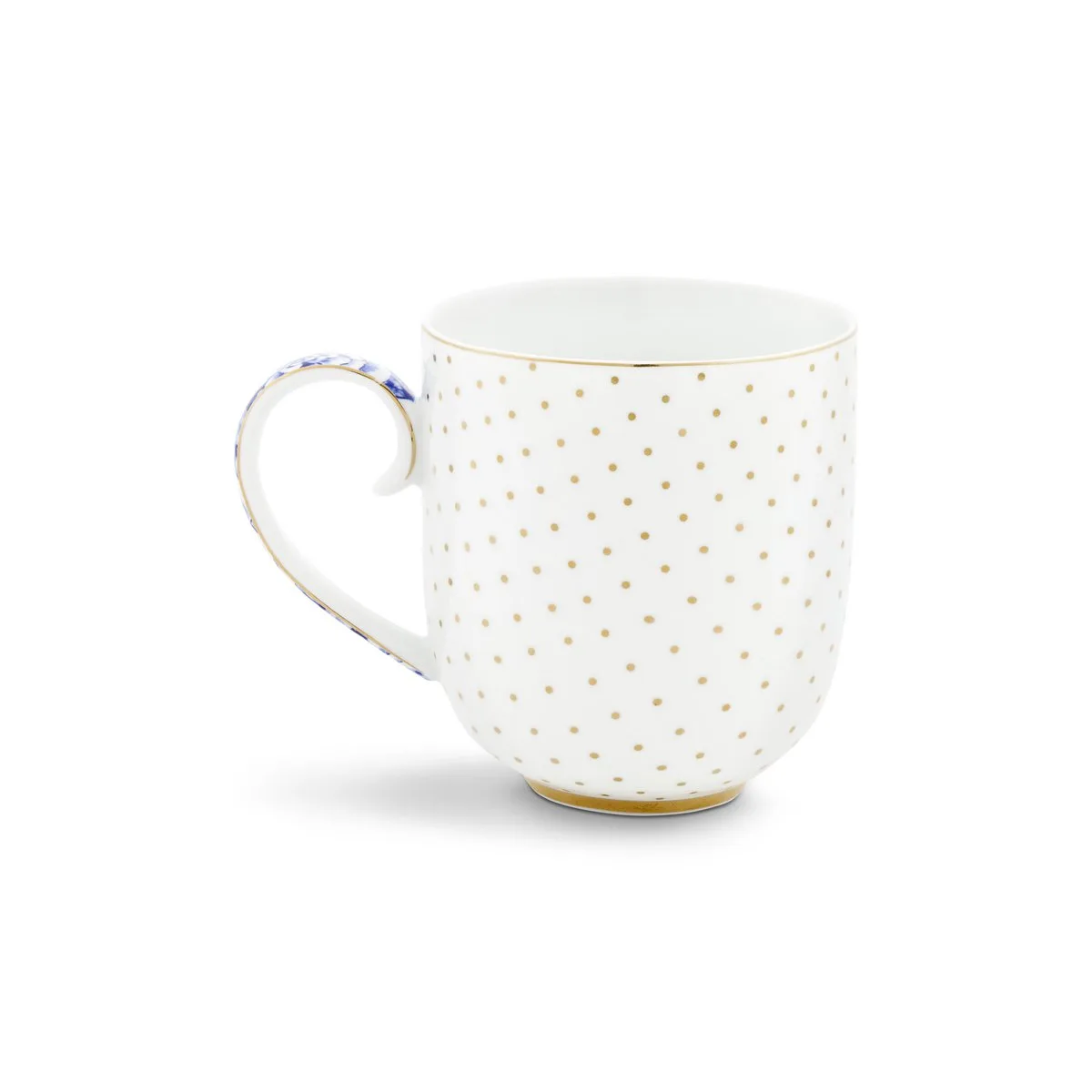 De mok van 260ml uit de Royal White collectie van Pip Studio is een prachtig item dat elke koffie- of theeliefhebber zal aanspreken. De mok is gemaakt van hoogwaardig porselein en heeft een mooie witte achtergrond met een sierlijk bloemenpatroon in goud, dat met Japanse inkt is aangebracht.
