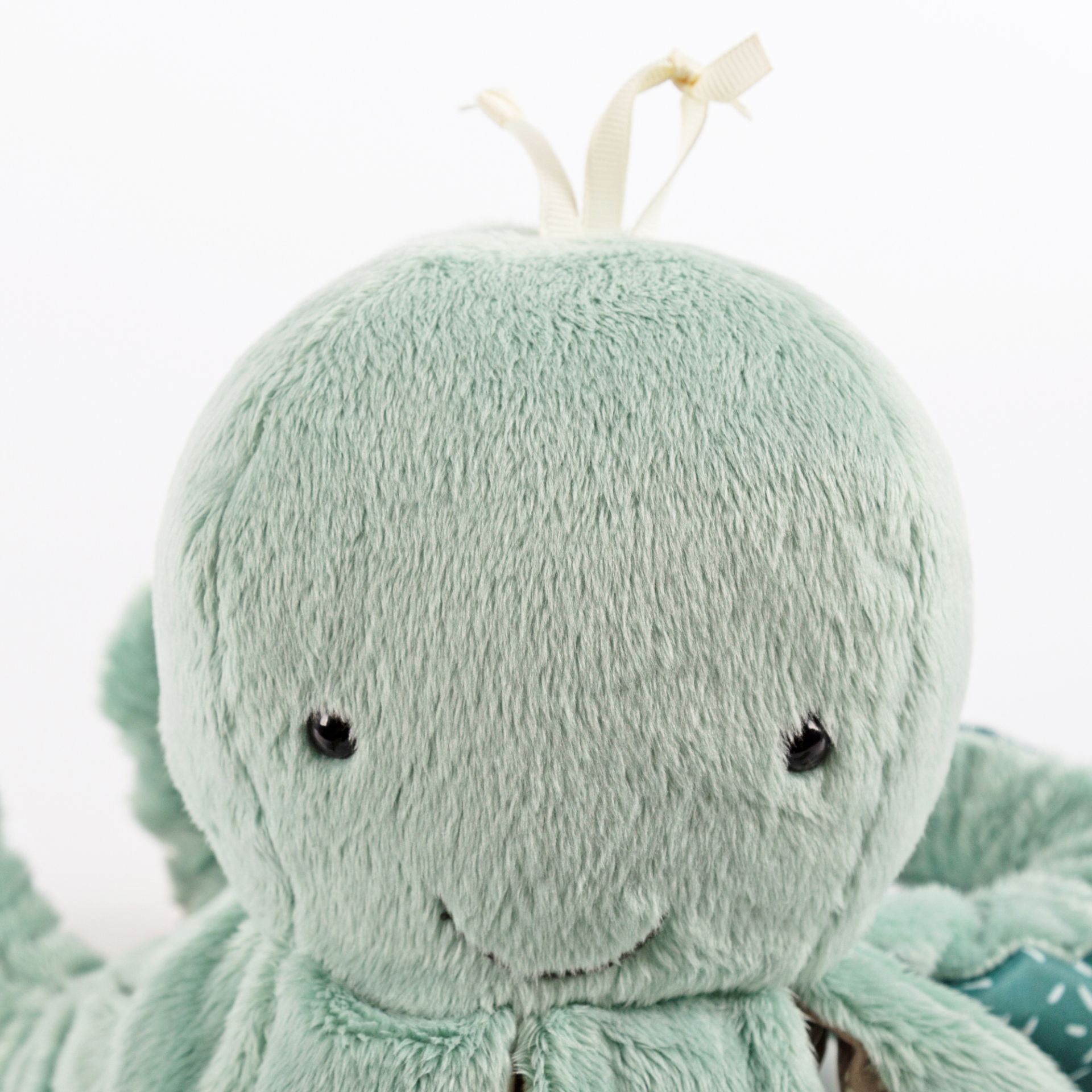 De kleine pluchen octopus heeft echt overal zijn handen in, want tot baby’s verbazing bevat hij een foliespiegel, rammelaar, ritselfolie, pieper en een kauwbaar bijtvlak. Veel te doen voor kleine ontdekkingsreizigers! Het zachte pluche in licht turquoise is ook supermooi – het maakt de vrolijke octopus een blikvanger waar je kleintje ook mee speelt.