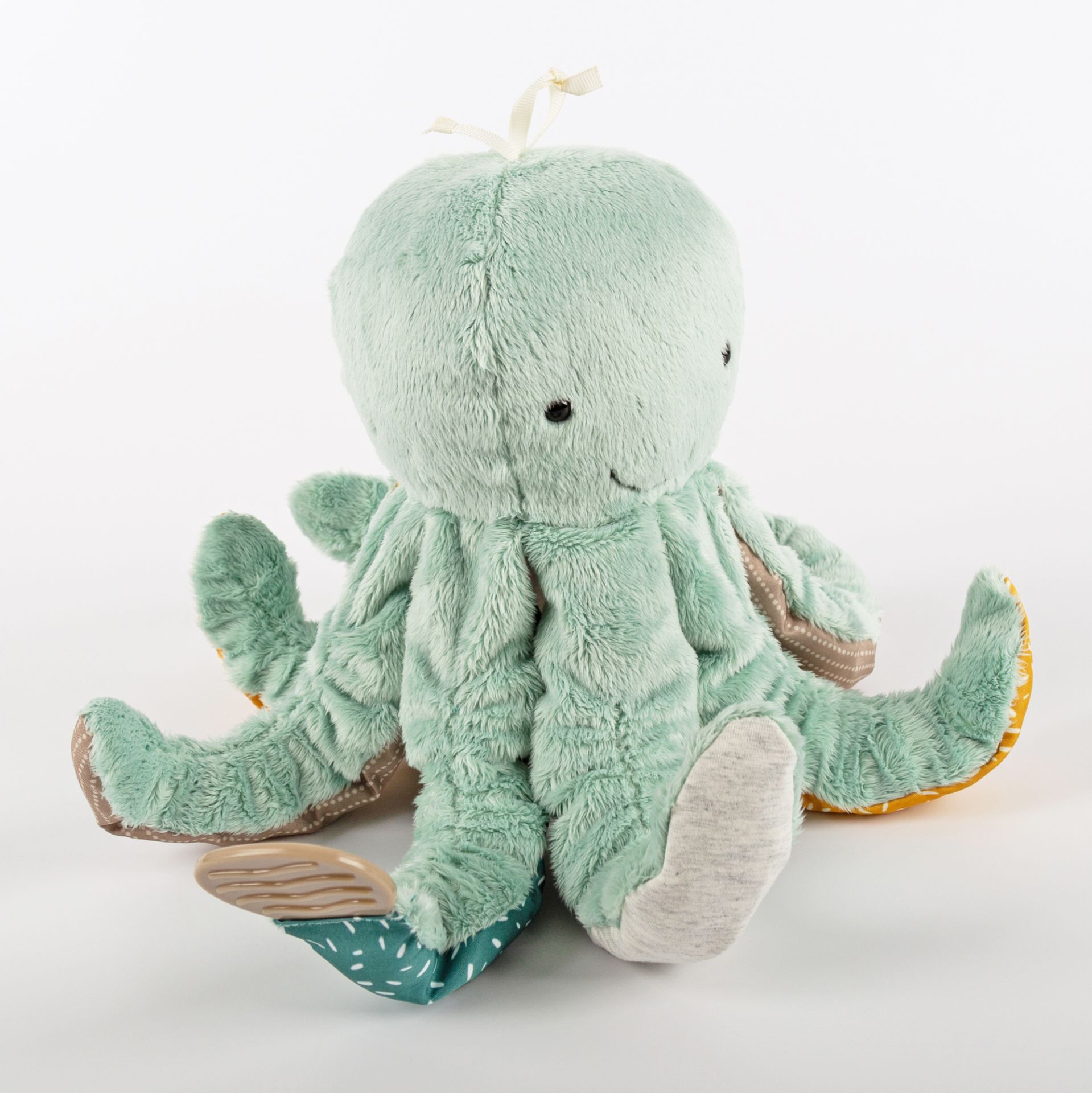 De actieve octopus is een echte alleskunner voor baby’s: babyspeelgoed en knuffel in één. De in de tentakels verborgen functies, zoals knetterend folie, piepen en rammelen, motiveren de baby om de knuffel met al zijn zintuigen te verkennen en zo zijn motorische vaardigheden te ontwikkelen.